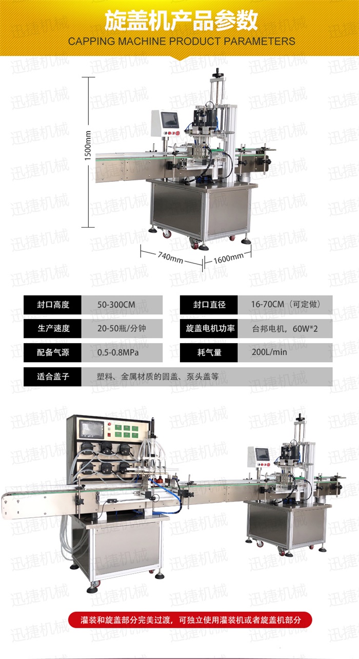 工作流程:液體灌裝頭自動(dòng)定位定量灌裝,機(jī)器灌裝完成1-10升的灌裝,隨即進(jìn)入下一個(gè)工位,震盤自動(dòng)理蓋,自動(dòng)上蓋,自動(dòng)旋緊瓶蓋。整個(gè)生產(chǎn)過程只需要人工放空桶。提升工作效率,降低勞動(dòng)強(qiáng)度。