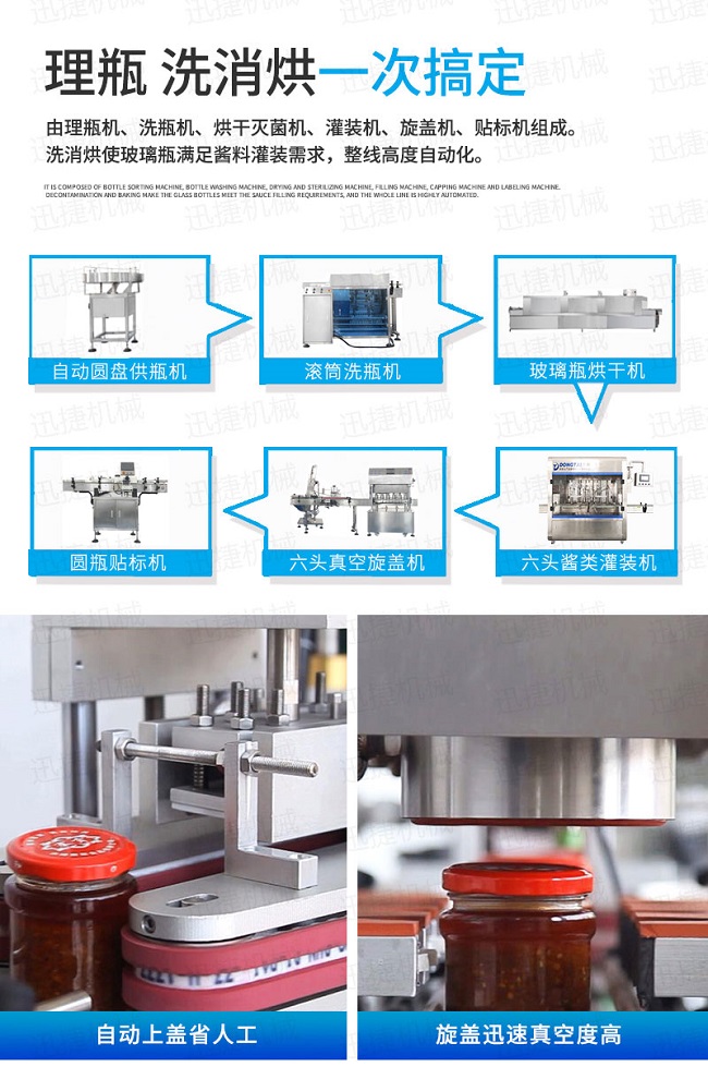 自動化醬料灌裝旋蓋貼標(biāo)生產(chǎn)線優(yōu)勢: