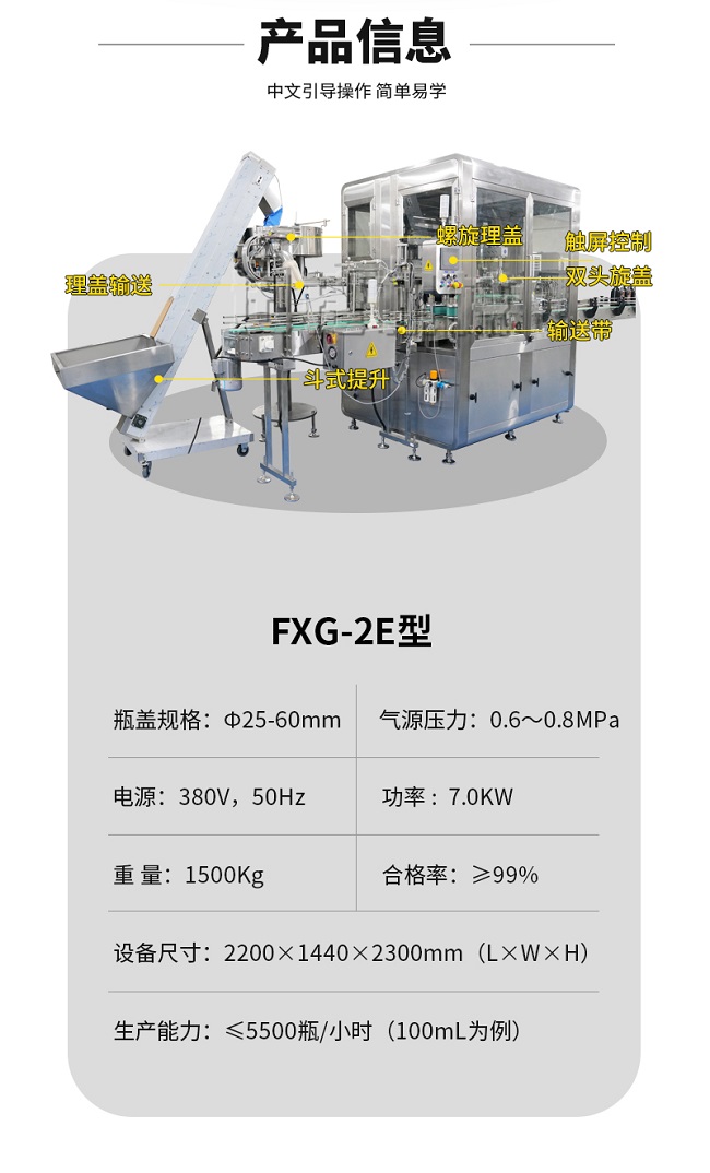 FXG-2E型全自動(dòng)雙頭跟隨式旋蓋機(jī)由理蓋輸蓋機(jī)構(gòu)、抓蓋旋蓋機(jī)構(gòu)、運(yùn)動(dòng)模塊、