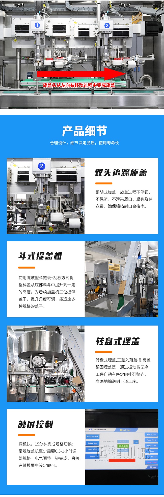 2、品質(zhì)高:跟隨式旋蓋,旋蓋過(guò)程不停頓,不晃液,不污染瓶口、瓶身及輸送帶,確