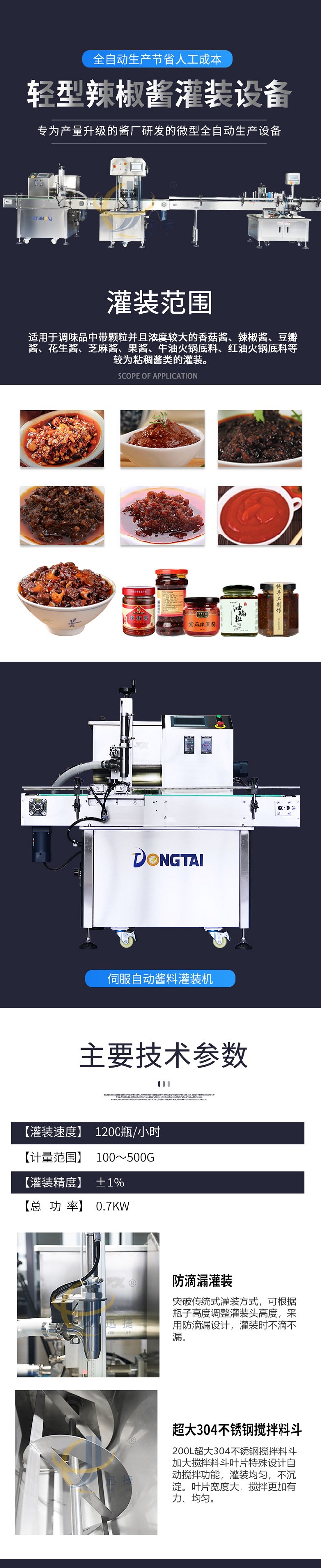 這款小型辣椒醬灌裝生產(chǎn)線是本公司專(zhuān)為產(chǎn)量升級(jí)的醬廠研發(fā)的微型全自動(dòng)生產(chǎn)設(shè)備,適用于調(diào)味品中帶顆粒并且濃度較大的香菇醬、辣椒醬、豆瓣醬、花生醬、芝麻醬、果醬、牛油火鍋底料、紅油火鍋底料等較為粘稠醬類(lèi)的灌裝。